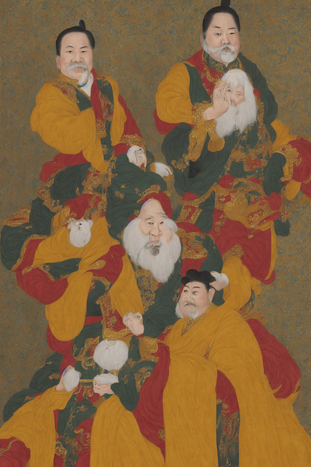 Prompt: A character portrait of a pompous and heavyset Chinese palace official (Mandor). He is wearing yellow silk robes that are slightly stained. He has a thin, arrogant mustache and a large jade ring. He is holding a jade abacus and looking down at the viewer with contempt. Background: A busy, dusty imperial stable with golden straw. Detailed character art, historical-fantasy style, 8k.