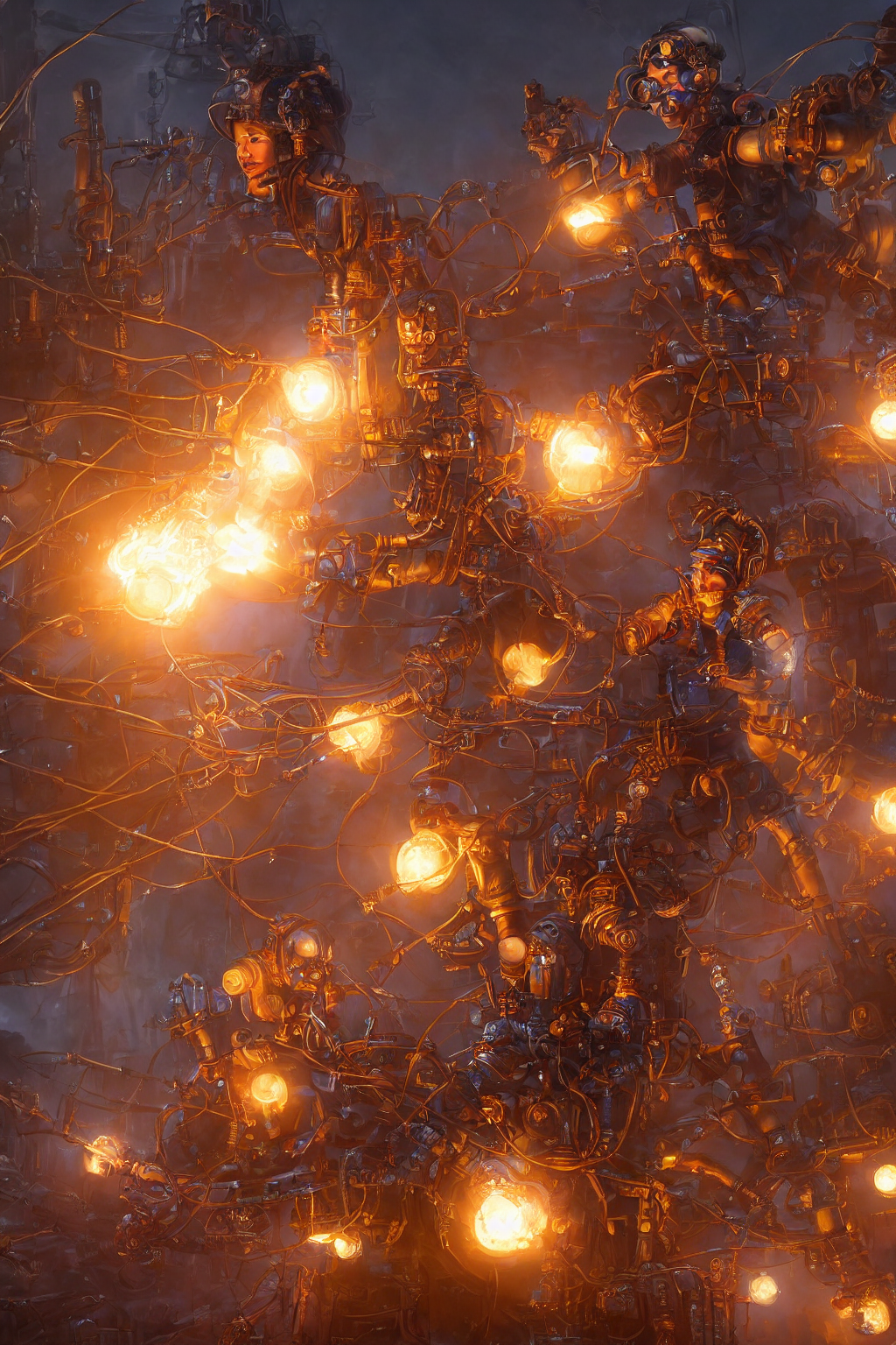 Prompt: A portrait of an eccentric young Bugis female engineer, Besse Kajang. She is petite and energetic, her face and arms smudged with black engine oil. She wears a unique mix of traditional Bugis fabrics and steampunk gear, with large crystal goggles on her head. Her belt is heavy with various bronze mechanical tools. She is surrounded by floating gears and blue spirit-sparks. Background: A high-tech ancient workshop filled with giant wooden ship parts and glowing copper wires. Ghibli-meets-Cyberpunk style, 8k, vibrant lighting.