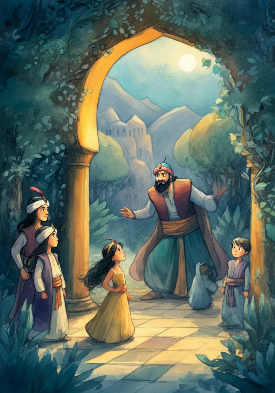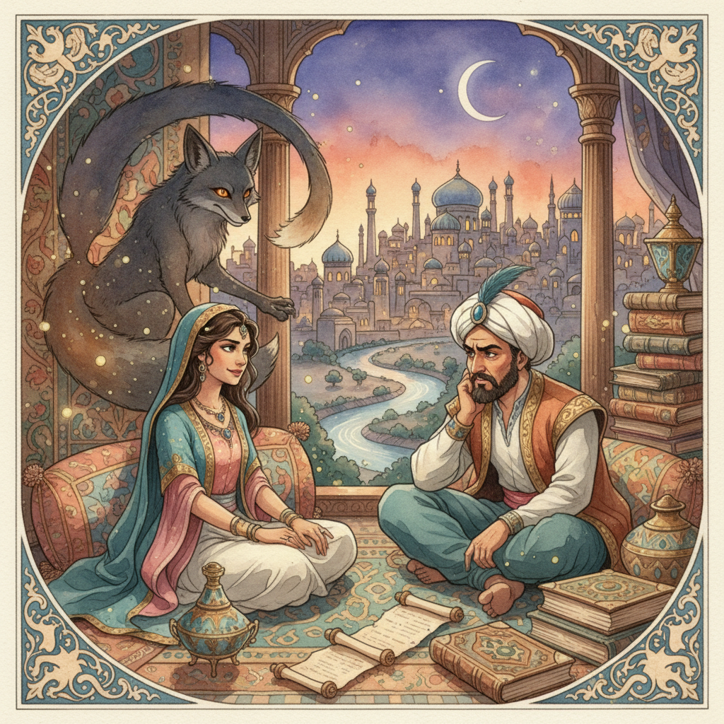 The story is presented as a tale told by a Wazir to a King, a common framing device in Arabian Nights-style literature, emphasizing its didactic purpose within a larger narrative.