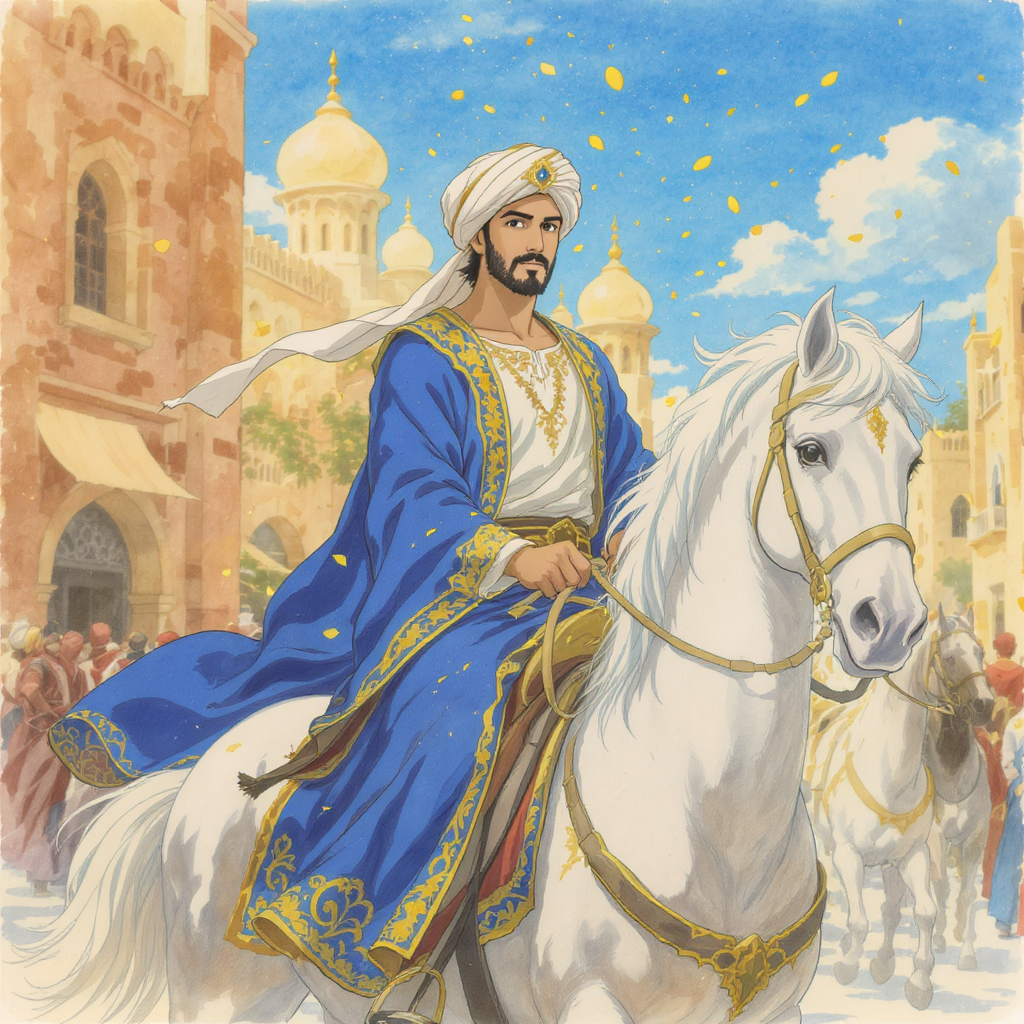 Attire: Simple, practical clothing suitable for travel and daily life in the Middle East, such as a loose-fitting tunic (thobe) made of linen or cotton, possibly in earthy tones, with a sash around the waist. He might wear sandals or soft leather boots.