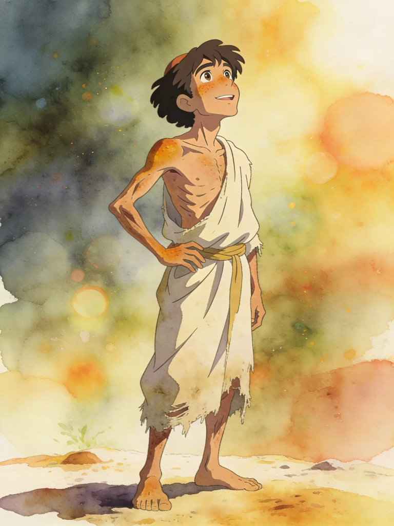 A small, slender boy, initially ten years old, with a bright and open face. His build is typical of a child from a poor family, likely lean from occasional hunger.