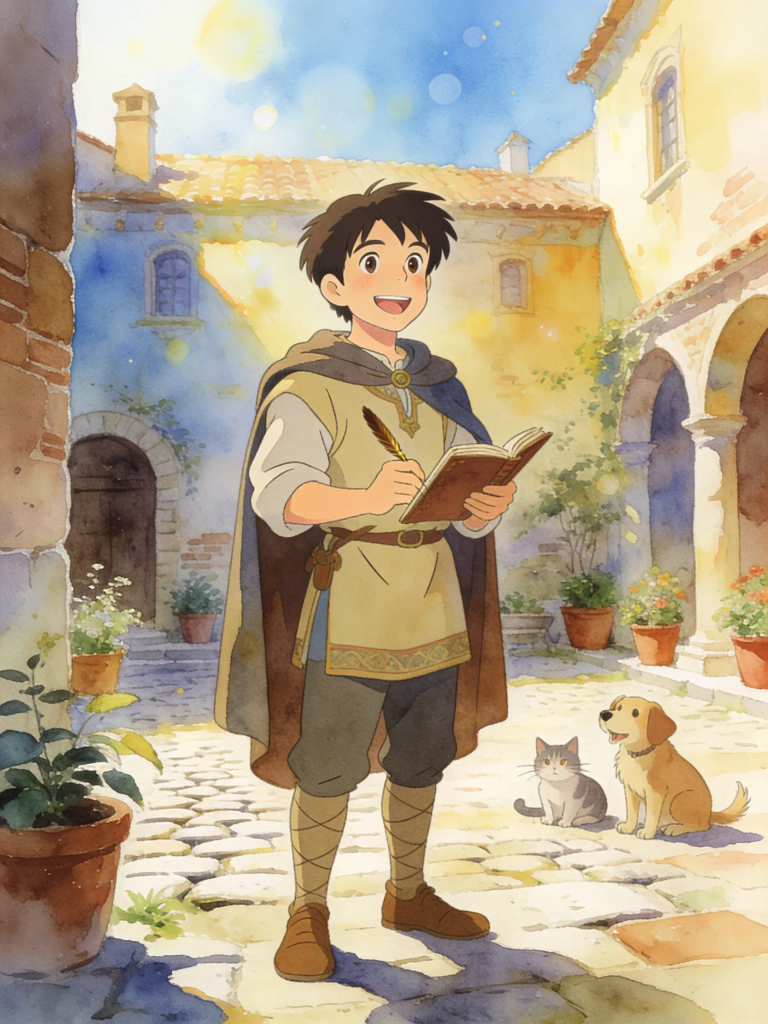 Attire: Practical, simple working clothes, likely a tunic and trousers made of sturdy linen or cotton in earthy tones, perhaps with a leather apron. His clothes would show signs of his trade, possibly with threads or pins.
