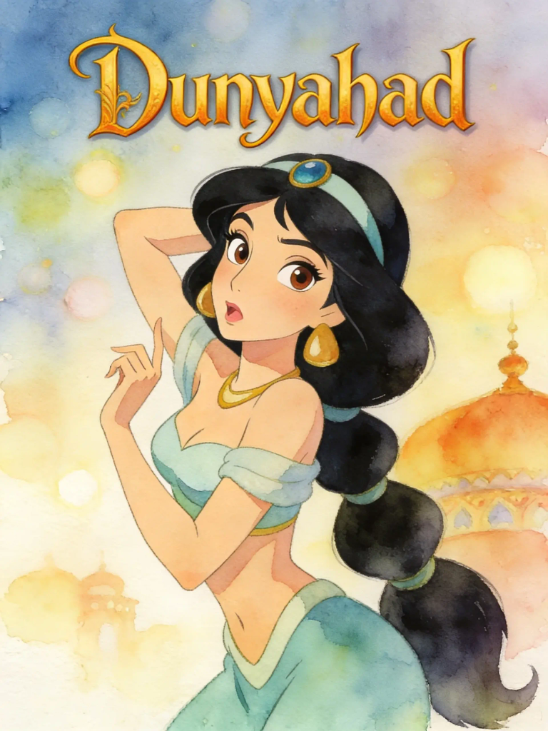 Her beauty is described as exceeding all imagery, dazzling the eyes like a sun. She possesses an ethereal and captivating presence. Her complexion is likely fair and radiant, contrasting with her dark hair and eyes, typical of a beautiful maiden in Middle Eastern tales.