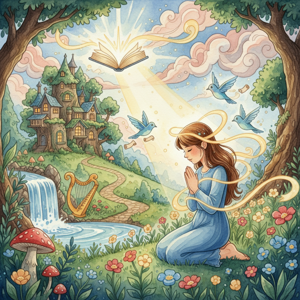 Attire: Simple but elegant garments, perhaps a flowing silk dress in a soft, light color (like cream or pale blue) that highlights her beauty, possibly with subtle embroidery, indicating her captivity but inherent nobility. She is found knitting, suggesting a modest, domestic appearance.
