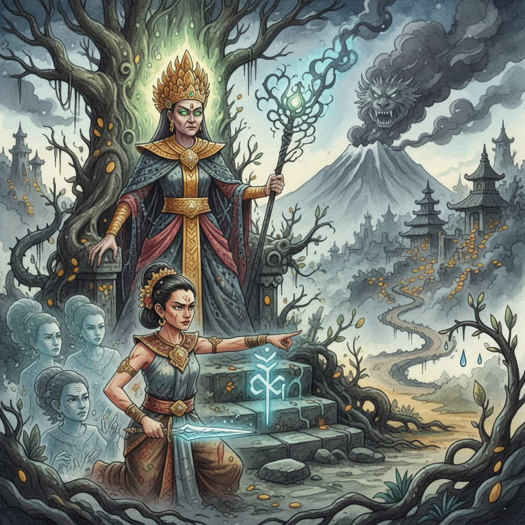 Exactly at midnight there was an earthquake, after which appeared a dense cloud, out of which emerged the seven-headed genie and approached the tree which bore the precious fruit.