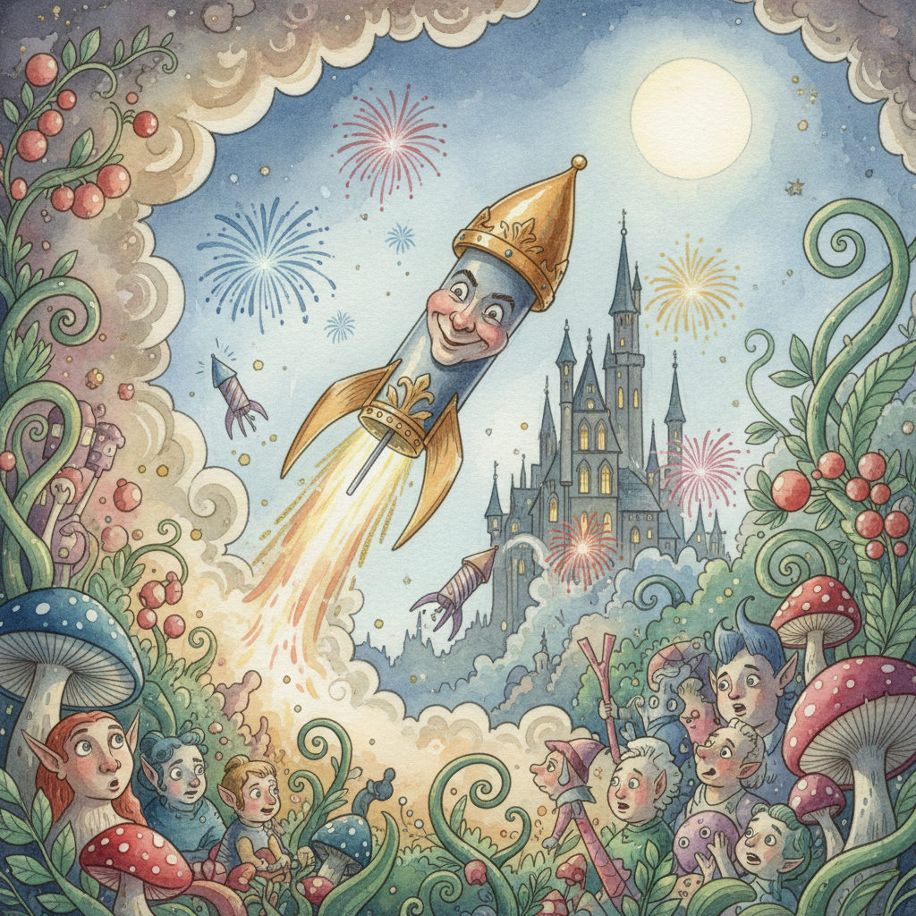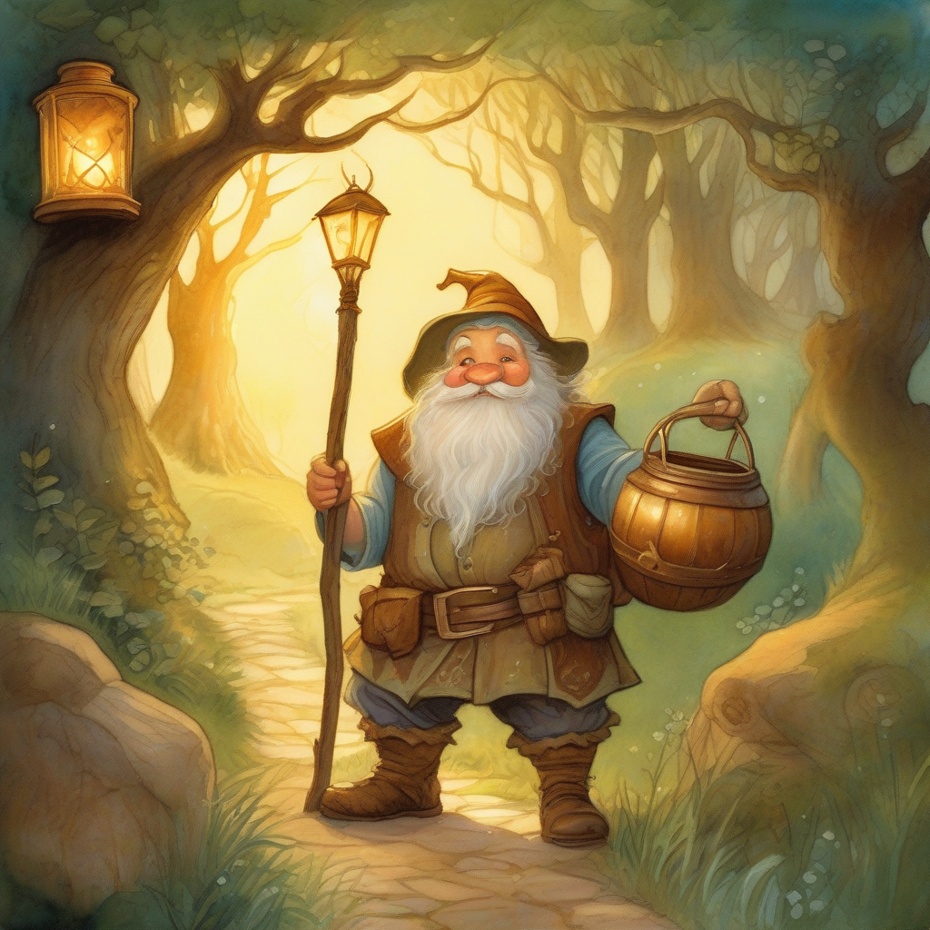 Attire: Initially found without specific clothes, but later receives an outfit from his Godmother, and then retrieves his own royal treasury of clothes. These would be miniature, finely made garments suitable for a gnome prince, likely in rich, natural colors and fabrics like silk or velvet, scaled down.