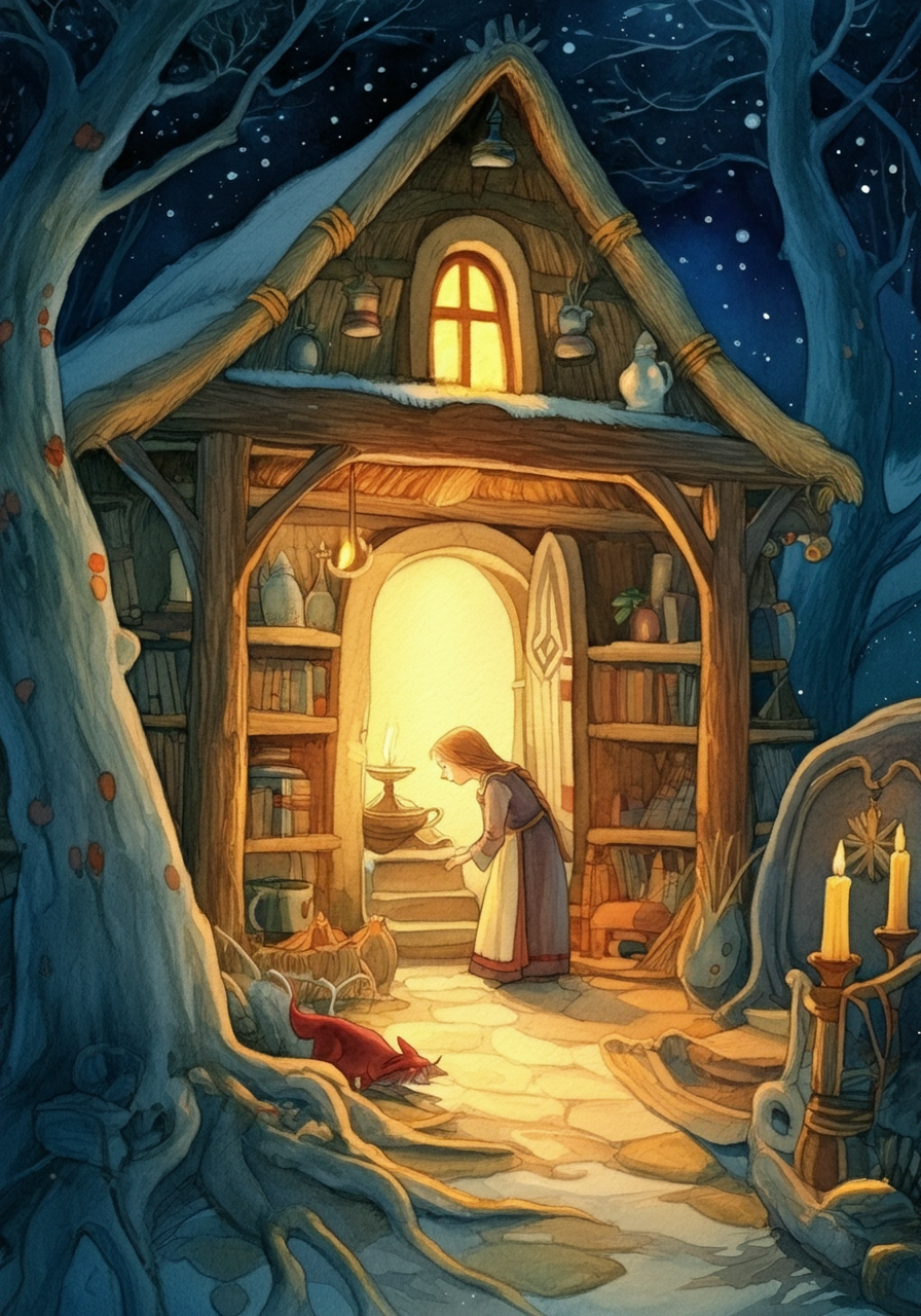 The winter was cruelly cold. Snow covered the paths and drifted high against the little hut. With difficulty the herb woman made paths to the stable and to the brook.