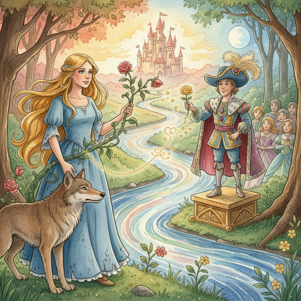 A dense forest or wooded area bordering the village, serving as the fox's retreat and home.