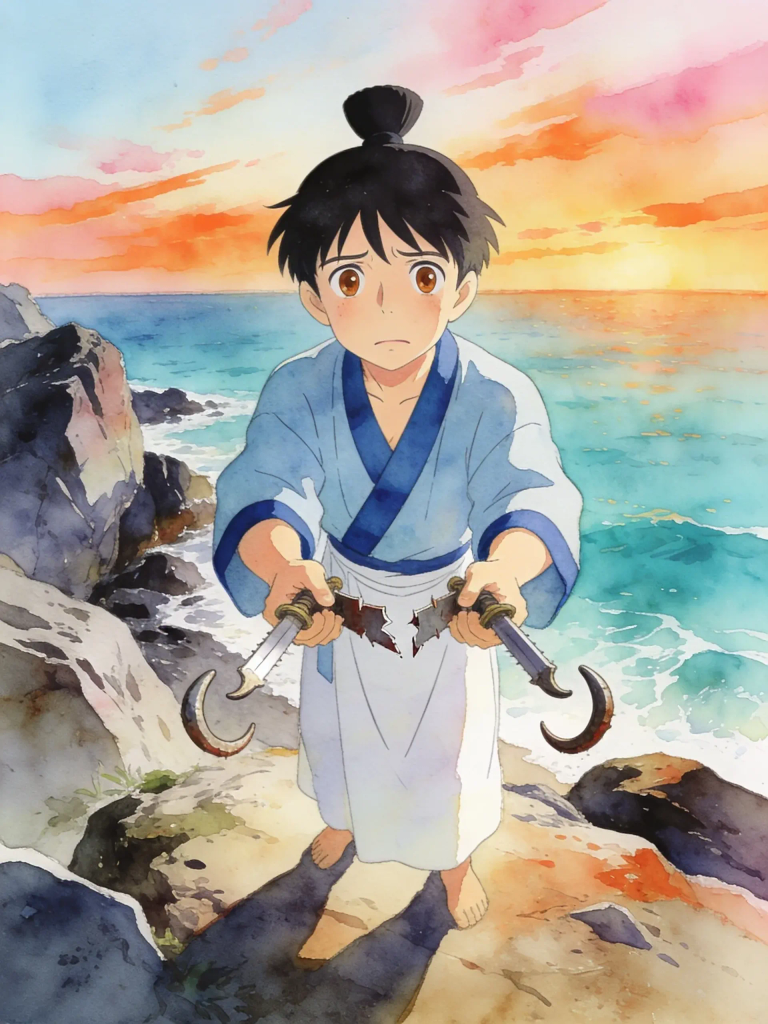 This story blends elements of the legendary Prince Yamato Takeru (historical figure/legend) with the folk tale of Momotaro (Peach Boy), creating a composite hero. The Kusanagi sword is a real imperial regalia.