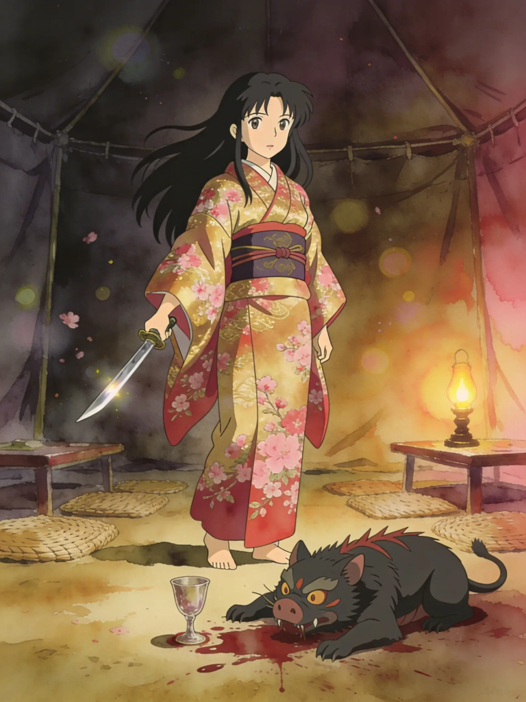 Prince Yamato infiltrates the enemy camp disguised as a woman to assassinate the brigand chiefs.
