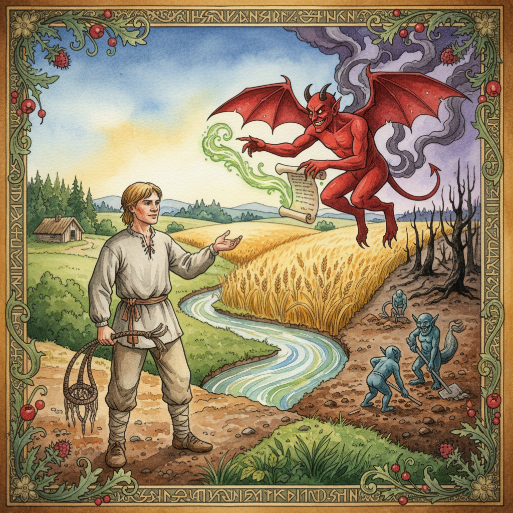 The son, transformed into a black stallion, is repeatedly sold by his mother to the Loihtija in an attempt to escape his grasp.
